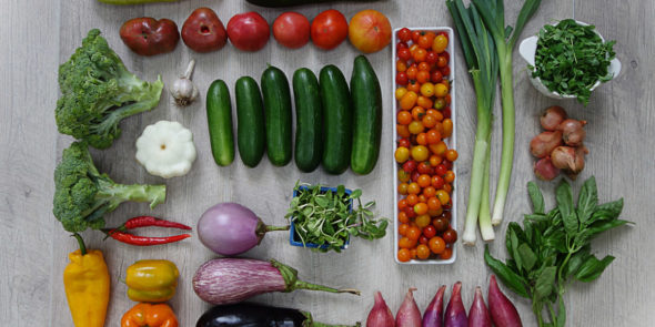 Heirloom tomatoes, cherry tomatoes, broccoli, eggplant, german extra-hardy garlic, red torpedo onion, bronze shallots, red or yellow sweet peppers, zucchini, summer squash, english cucumbers, leeks, sunflower shoots, pea shoots, basil, and cayenne pepper.