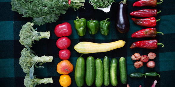 Sweet pepper, green pepper, heirloom tomatoes, broccoli, purple stripe garlic, red torpedo onion, shallots, jalapeño peppers, zucchini, summer squash, leeks, eggplant, english cucumbers, and curly kale.