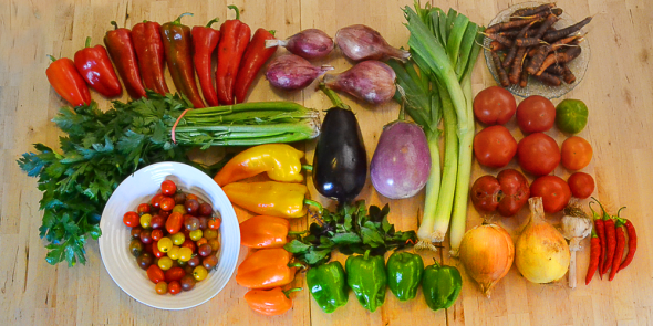 Whats in the box: Purple haze carrots, slicing tomatoes, heirloom tomatoes, cherry tomatoes, eggplant, purple glazer garlic, sweet yellow onions, red torpedo onions, green peppers, red italian frying peppers, yellow Italian frying peppers, leeks, celery (large shares only) and holy basil, and cayenne pepper.