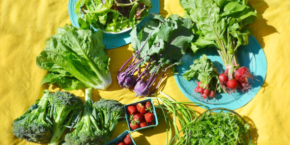 Whats in the Box: Kohlrabi (green or purple), salad mix (all lettuce blend), romaine lettuce head, red radish, arugula, broccoli, garlic scapes, chioggia beets, strawberries.