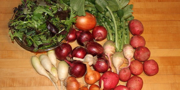 What’s in the Box: Red potatoes, red storage onion, yellow storage onion, shallot, spicy salad greens mix, beauty heart radish, and porcelain garlic.