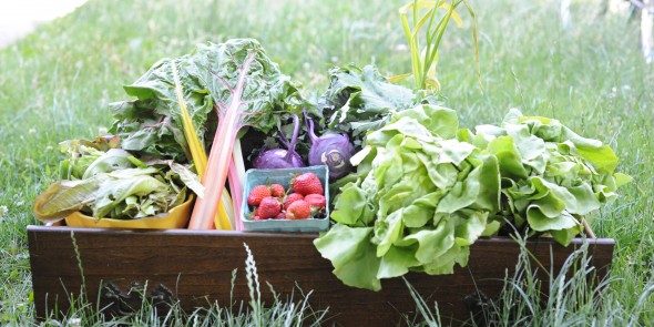 What’s in the Box: Strawberry, purple kohlrabi, swiss chard, green garlic or garlic scapes, buttercrunch lettuce heads, lettuce mix, red russian kale.