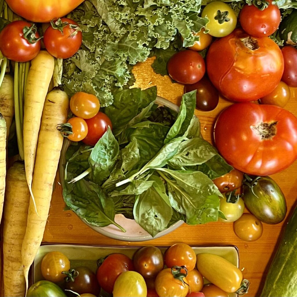 Week eleven is here and we are in our peak tomato season here at the farm! We have been picking them daily to keep them in the best condition we can. We almost never refrigerate our tomatoes and i would suggest also not doing that unless they are cut open or overripe as it makes them less sweet. Room temperature is the best way to store them and let them ripen. Expect a lot of tomatoes this week! We’ve been trimming garlic and making room to start more micros for fall in the process, hopefully we can start doing those again soon if the weather will cool off. It was a hot week to end July for this last week so surely we will pace ourselves through all these 90 degree days and keep the water flowing to help the sweet and hot peppers, come along faster. Here is the crop list for this week.